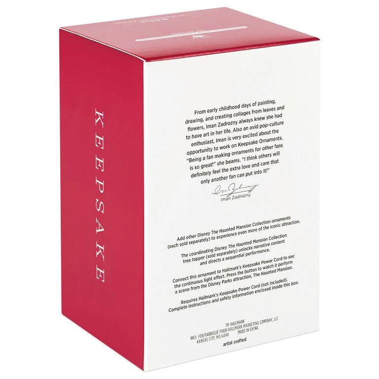 - Key Features: Connect the Interactive Light and Sound ornament to Hallmark’s Keepsake Power Cord (sold separately) to see the continuous light effect. Press the button to watch it perform a scene from the Disney Parks attraction, The Haunted Mansion. Add other Disney The Haunted Mansion Collection ornaments to experience even more of the iconic attraction. The coordinating Disney The Haunted Mansion Collection tree topper unlocks narrative content and directs a sequential performance.