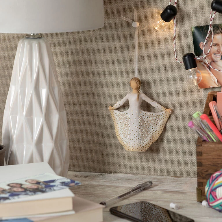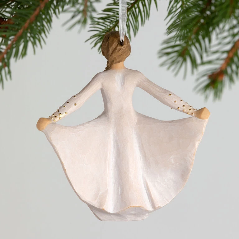 Commend the qualities of courage and strength that you see in a daughter, sister or friend when you give her this Willow Tree Christmas tree ornament. With beautiful outstretched arms and a gold leaf embellished skirt, this resin girl figurine resembles a beautiful butterfly, commemorating the determination and resilience of a life journey or transformation. The beautiful keepsake makes a perfect gift to celebrate a special event, such as a birthday, graduation, recital and religious event.